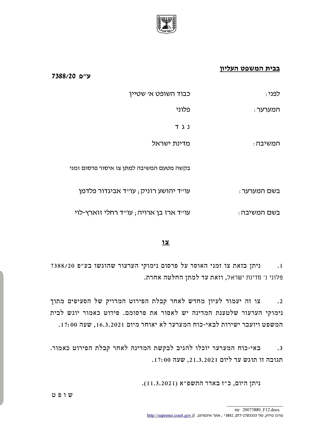 בהחלטה קבע השופט שטיין כי בתוך שבוע תפרט הפרקליטות על אלו סעיפים בערעור בכוונתה לבקש את צו איסור הפרסום הקבוע. נציין כי מדובר בבקשה חריגה ביותר של הפרקליטות.