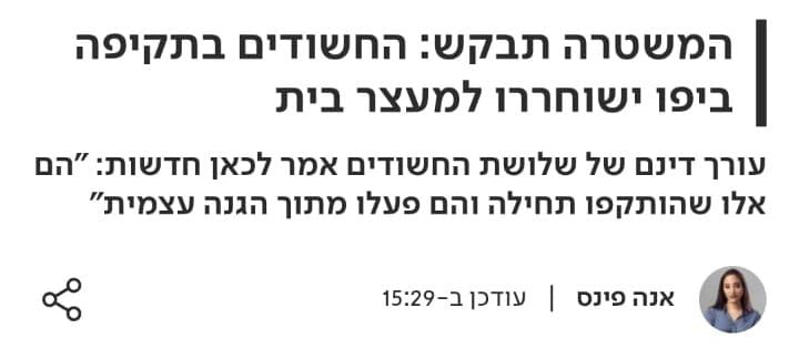 שבוע לאחר מעצרם של שלושת החשודים באירוע התגרה ביפו בין ערבים ויהודים, המשטרה תבקש בעוד זמן קצר מבימ”ש השלום בתל אביב להורות על שחרורם של שלושת החשודים היהודים. בקשת השחרור מגיעה לאחר שמהרגע הראשון עמדו החשודים על כך שהם אלו שהותקפו בידי הערבים באירוע. בדיונים בבית המשפט נחשף כי בעלה של המתלוננת רדף אחרי הבחורים היהודים עם סלע גדול בידו וניסה להטיח בהם את הסלע, זאת לאחר שוויכוח בין הצדדים התלהט והמון ערבי הקיף את הבחורים היהודים. את הבחורים היהודים מייצג עו”ד אסף גונן מארגון חוננו.